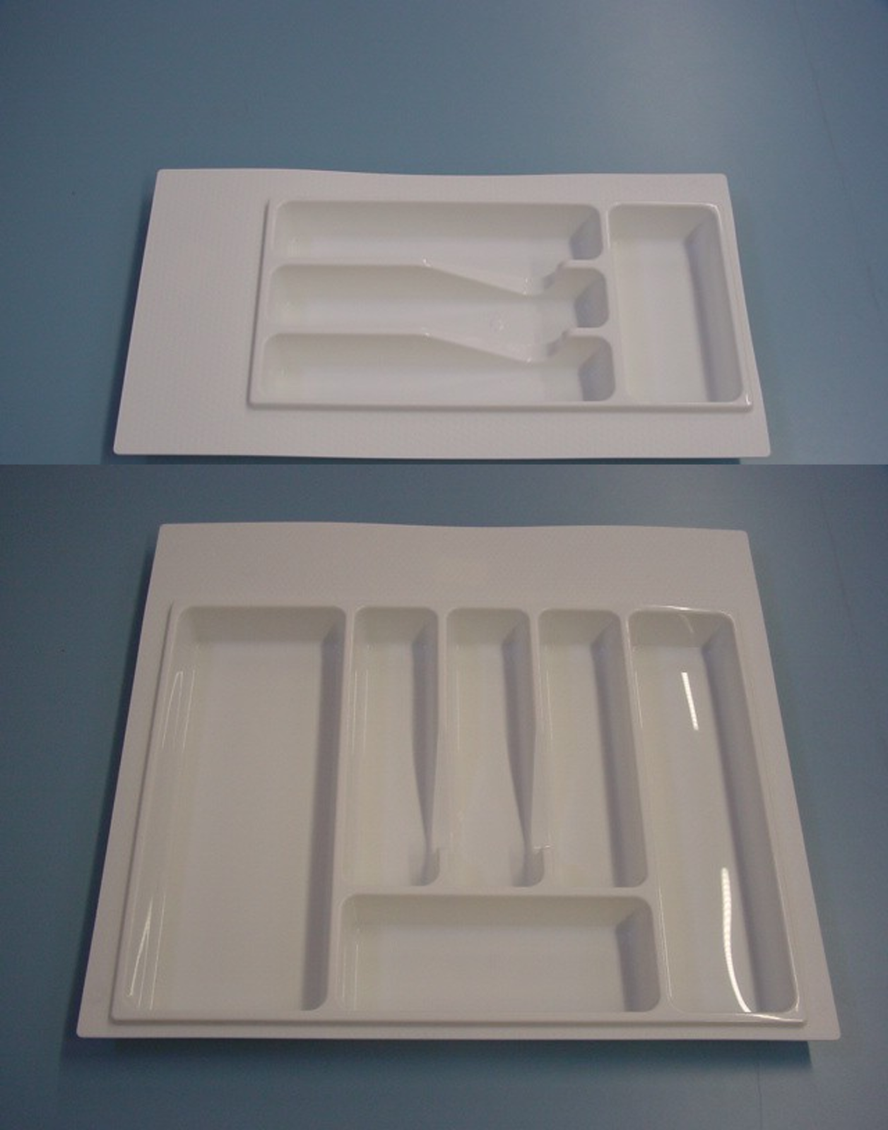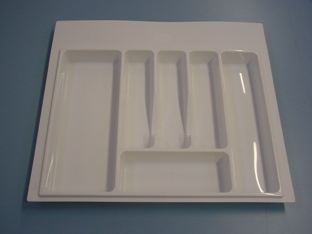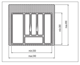 Compartimentare tacamuri Eco, pentru sertar cu adancime de 450 - 500mm, A=380/490mm, finisaj Alb. Cu ajutorul profilului de cuplare ( 556.46.790) se pot cupla 2 suporturi de tacamuri, pentru sertare in corpuri mai mari de 600mm. Material: plastic
